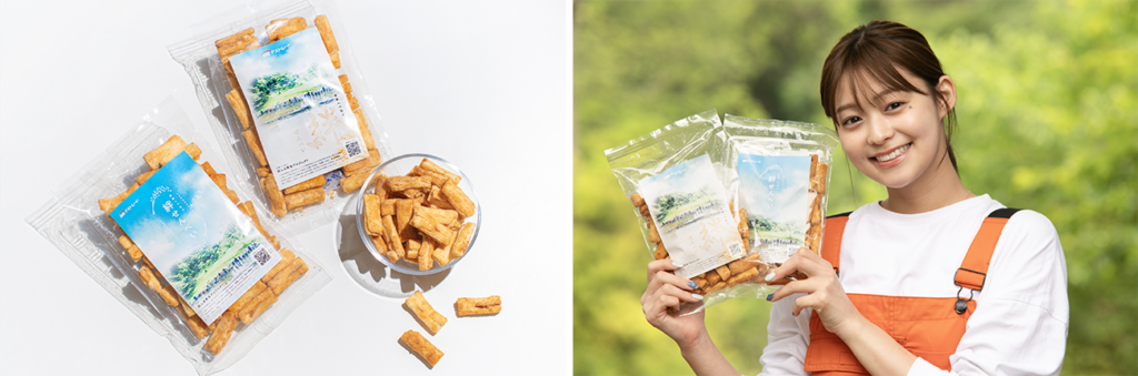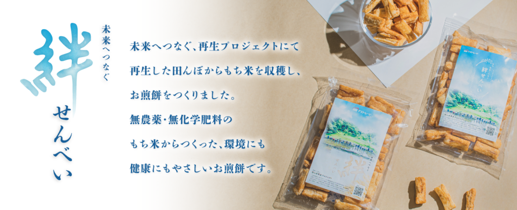 霞ヶ浦周辺地域の方々や地場産業のご協力のもと、2023年に再生した田んぼから収穫した無農薬のもち米を使用してお煎餅を製造しました。お煎餅名は、本プロジェクトを通じた様々な繋がりや地域や参加者との絆への想いを込めて、『未来へつなぐ、絆せんべい』と名付けました。お煎餅のラベルシール貼付や袋とじ作業は、牛久市内の福祉作業施設の方々にご協力をいただきました。